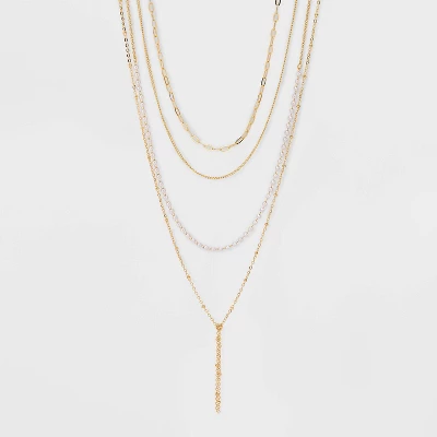 Showcase your love for accessories with the Four Row Pearl Chain Necklace from A New Day™. This gold-tone necklace features varying-design gold-tone chains and a faux-pearl chain for a gorgeous look. Complete with an extender chain and a lobster-claw clasp closure, this nickel-free necklace fits nicely around your neck.