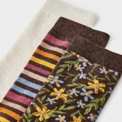 Women’s Floral & Striped 3pk Crew Socks – A New Day™ Brown Heather/Burgundy/Ivory 4-10