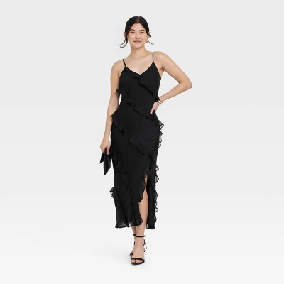 Add a modern twist to your wardrobe with this Ruffle Maxi Slip Dress from A New Day™. Made from 100% recycled polyester with lining, this maxi slip dress features a deep V-neckline and square back for a classic look. Designed with adjustable spaghetti straps for a customizable fit, this sleeveless dress adorns asymmetrical ruffles all over the dress for flowy charm. Plus, the side slit allows easier movement and adds a dramatic touch. Pair it with matching accessories and footwear to complete the chic outfit.